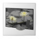 Esta imagem fora do quadro apresenta dois lírios de água delicados em matizes macios, amarelo-pálidos, destacando-se claramente contra um pano de fundo de almofadas, lírios cinza e água. As flores estendem-se para além do quadro delimitado por preto, criando um efeito dinâmico, quase tridimensional. O contraste entre os florescentes vibrantes e os subjugados arredores destaca a delicada beleza e tranquilidade da cena, evocando um senso de calma e elegância silenciosa.