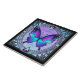 Uma borboleta vibrante com tons de azul e roxo é centrada dentro de um design circular ornamentado, cercada por intrincados padrões florais e joias decorativas. A composição total expele uma estética de vidro manchado com uma mistura harmoniosa de cores e simetria.