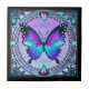 Uma borboleta vibrante com tons de azul e roxo é centrada dentro de um design circular ornamentado, cercada por intrincados padrões florais e joias decorativas. A composição total expele uma estética de vidro manchado com uma mistura harmoniosa de cores e simetria.