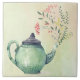 A ilustração da cor da água apresenta um grande bule verde com primaveras de bagas e galhos de folhas em fundo de lavagem abstrato