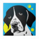 Cachorro-pintor preto-e-branco sobre fundo azul com círculos amarelos