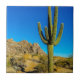 A fotografia caracteriza um grande cacto multi-armado do saguaro por uma fuga de caminhada que conduza para uma montanha strewn pedregulho no deserto de Sonoran.