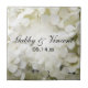 Personalize o bonito Azulejo de Casamento Floral de Hydrangea White com os nomes pessoais da noiva e da data da cerimônia de noiva e casamento para criar um presente de manutenção para recém-casados, damas de honra ou assistentes. Este elegante azulejo nupcial botânico personalizado apresenta uma fotografia floral aproximada de uma flor branca de hydrangea.