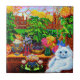Azulejo com a pintura de animais de Louis Wain Master of Cat College (1860-1939). Um gato branco pensativo com olhos azuis impressionantes senta-se pesadamente ao lado de uma variedade vibrante de flores bonitas. A majestosa faculdade de gatos venta no fundo sob um céu rosa e azul. Um presente maravilhoso para amantes de gatos e arte inglesa.