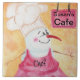 Azulejo trivet com um chef de neve no chapéu de chef e avental vermelho com um sinal personalizado ao fundo. Arte original inspirada pelo próprio panda de biscoito de Visages também por Deborah Miller