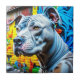 Arte digital urbana colorida com um Pitbull sentado numa rua da cidade rodeada por arte de rua de grafite.