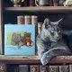 Gato de taça britânico de cinzas bonitas sentado com um brinquedo de gato e um ursinho de pelúcia. O gato espera que o seu anterior mal-estar em que se envolveram seja responsabilizado pelo cão.