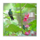 Foto de um colibri tropical e de flores em um jardim em Costa Rica. Este é um homem brilhante coroado verde do colibri que mostra suas penas verdes bonitas e flores bonitas do folha do verde e as cor-de-rosa que cercam o. Há um outro vôo do colibri no fundo.