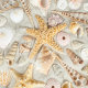Uma coleção vibrante de conchas e uma estrela espalhada por uma superfície arenosa. A cena apresenta uma variedade de texturas e cores, desde conchas lisas e brilhantes até estrelas-do-mar naturais.
