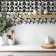 Azulejo de cerâmica floral, preto e branco, com acento monocromático