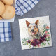Um belo retrato de um cão Gado Australiano emerge de um buquê vermelho e rosa de um criminoso neste azulejo decorativo. Por trás da imagem do cão está um spray de confete de ouro. Tudo é colocado sobre um fundo branco.