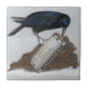 Desenho a lápis colorido de um curioso corvo investigando uma harmônica brilhante que encontrou.