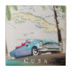 Mapa ilustrado de Cuba (além das ilhas circundantes) em um belo estilo vintage detalhado com um carro cubano clássico no pôr do sol.