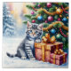 Fluffy gray kitten with sapphire eyes peeks from golden gifts beneath a glowing Christmas tree. Snowflakes dance around twinkling ornaments.