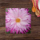 Azulejo cerâmico que mostra a foto de uma grande floração rosa de Dahlia com centro amarelo. Um design floral adorável! Selecione o tamanho do seu azulejo. Faz uma bonito trivet de cozinha!