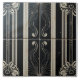 Azulejo cerâmico Art Deco com quatro azulejos preto e branco com padrões florais e geométricos, dispostos num design quadrado simétrico, flanqueado por linhas brancas verticais de espessura variável e elementos florais, estilo de colheita, decorativo, elegante, minimalista.