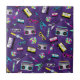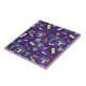 Um design bonito que é bonito, esse azulejo cerâmico apresenta um fundo violeta com itens antigos como fitas cassete, rádios, raios de sol etc. Adicione ao carrinho hoje!