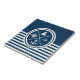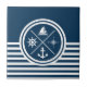 Design náutica com símbolos náuticos (âncora, barco à vela, roda à vela, bússola) decoração em fundo listrado branco e azul marinho.