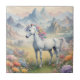 Um azulejo cerâmico mostrando uma imagem sonhadora de um unicórnio branco com um mané arco-íris em um campo de flores. Ao fundo estão montanhas majestosas. O presente perfeito para dar àqueles que amam unicórnios mágicos e místicos. Contém conteúdo generativo.