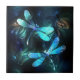 Duas libélulas transparentes, luminosas, turquesas, desenhadas artisticamente sobre fundo noturno, com algas e vagalumes luminescentes do lago. Dragonfly brilhante.