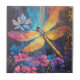 This hand-finished ceramic tile brings vibrant artistry to any space, showcasing a radiant dragonfly mid-flight surrounded by lush blooms in shades of lavender, blue, and rose. The dragonfly’s iridescent wings glimmer in orange, yellow, and pink, while its body shimmers in cool blue-violet tones—adding a lively focal point against the deep, moody backdrop with glints of metallic gold.