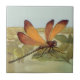 belíssima libélula vintage que repousa sobre uma folha. o inseto tem tons dourados e castanhos e o fundo mostra um pântano com água e almofadas de lírios.