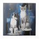 Azulejo cerâmico em dois gatos sentados graciosamente sobre fundo abstrato, azul profundo. As texturas realistas de pelo com ousada linhagem e elementos geométricos criam uma atmosfera moderna e surreal. Seus olhos amarelos expressivos contrastam impressionantemente com os arredores legal.