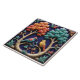 Azulejo cerâmico com duas aves coloridas em uma floresta, sobre árvores coloridas estilizadas, sobre fundo azul escuro.