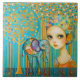 Um elefante estilizado e colorido fica ao lado de uma garota com olhos grandes e um chapéu branco, padronizado. Árvores pontilhadas e faixas verticais vibrantes enchem o fundo com um senso de fantasia e maravilha. Digital Art Photoshop CS5