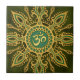 Um símbolo de Aum senta-se dentro de um design elaborado do sol. A estrela é compo de oito raios estilizados que esticam para fora como raios de um círculo no centro. As linhas e os pontos intrincados são coloridos com um amarelo dourado que seja destacado para dar ao teste padrão um brilho claro na superfície. Uma sombra cai no profundo - o fundo verde que faz o design parece flutuar apenas acima da superfície deste azulejo. Este design à moda é uma representação impressionante deste símbolo espiritual.