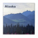 Montanhas azuis, água azul do lago, árvores verdes escuras, algas rosa e encharcadas. Uma representação do verão no extremo norte. A leitura de texto "Alaska" também é exibida. Mosquitos não incluídos.