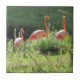 Três lindos flamingos cor-de-rosa rolando em um dia quente de verão no parque.