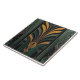 Painel do estilo Art Deco com um design floral simétrico, com uma flor estilizada central em ouro e verde, flanqueado por padrões geométricos e bares verticais, todos colocados sobre um fundo verde escuro com um acabamento envelhecido e texturizado.