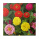 Azulejo cerâmico que apresenta uma foto de flores coloridas da Zinnia. Um design floral adorável! Selecione o tamanho do seu azulejo. Faz uma trivet de cozinha excelente!
