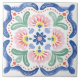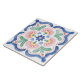 A square ceramic tile designs featuring folk-inspired botanical illustrations. Each tile displays a symmetrical garden motif—lilies, wild berries, and sprawling vines—rendered in soft watercolor washes. The artwork mimics a hand-painted glaze, with intentional "bleeding" edges and a subtle cracked ceramic texture (craquelure) for a rustic, heritage feel.