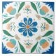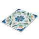 A square ceramic tile designs featuring folk-inspired botanical illustrations. Each tile displays a symmetrical garden motif—lilies, wild berries, and sprawling vines—rendered in soft watercolor washes. The artwork mimics a hand-painted glaze, with intentional "bleeding" edges and a subtle cracked ceramic texture (craquelure) for a rustic, heritage feel.
