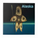 Uma imagem fractal em tons castanhos sugerindo um caçador Inuit altamente estilizado, vestindo roupas tradicionais de pele, segurando um arpão com cabeça de marfim. A imagem é sobreposta a um fundo que representa o inverno polar escuro. A leitura de texto "Alaska" aparece em azul e branco brilhantes.