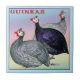 Galinhas da Guiné são criadas numa impressionante variedade de cores, com ou sem as pintas. Galináceos Coral Azul, Lavanda e Roxo Real são mostrados aqui.