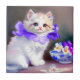 Azulejo cerâmico com um lindo gatinho branco! Um gatinho fofo veste um colar de flores roxo. Uma tigela azul de flores brancas e roxas senta à direita. Um presente maravilhoso para amantes de gatos e entusiastas de arte vitorianos!