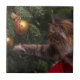 A design apresenta uma fotografia de um gato que procura uma decoração numa árvore de Natal.