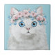 Características deste design um gatinho branco bonito que veste um halo cor-de-rosa e azul da flor.
