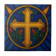 This ceramic tile shows a stained-glass artwork presenting a radiant and symmetrical composition centered around a golden Christian cross. The cross is in a rich metallic gold with flared ends and scalloped edges, evoking a sense of sacred elegance and craftsmanship. It is enclosed within a circular border that mirrors its golden texture, creating a focal point that anchors the entire design. Surrounding the cross are stylized floral and leaf motifs in jewel tones—deep sapphire blue, emerald green, ruby red and hints of amethyst—arranged in balanced symmetry. These elements are framed by a background of vibrant blue stained-glass pieces radiating outward, punctuated by warm amber-orange corner accents. Dark lead lines divide each glass segment, enhancing the clarity and structure of the design. The overall effect is one of spiritual reverence and visual harmony, combining traditional stained-glass artistry with a polished, professional finish.