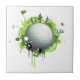 Ilustração moderna com golfe como tema. Uma bola de golfe representa a Terra com golfistas e bandeiras ao seu redor em tons de verde. Diversão e design moderna para o amante do golfe.