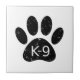 Um texto e impressão de pata de cão com estilo de desenho animado, com efeito de resmungão e ressonância aplicado à imagem. Azulejos cerâmicos personalizados com tema K9. Ideia do presente.