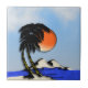 Palmeiras balneares balançando na praia de ilha com sol vermelho