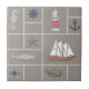 Ilustração temática náutica com cavalo de mar, barco à vela, roda à vela, âncora, farol, peixe, concha, espadarte e condecoração de bússolas em retângulos sobre fundo arenoso de grunge