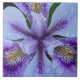 Azulejo cerâmico que mostra a foto de uma luz roxa, sem barba, floresce íris com salpicos de amarelo junto com gotas de chuva em suas pétalas. Um design floral adorável! Selecione o tamanho do seu azulejo. Faz uma bonito trivet de cozinha!