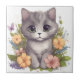 Azulejo De Cerâmica Kitten Cinza Doce com Flores Kawaii Chibi