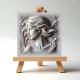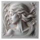 Uma representação muito detalhada de uma mulher. Seu cabelo flui em ondas suaves e complexas, criando um senso de movimento e fluidez. A matiz suave dá à peça uma qualidade etérea, quase de outro mundo, já que a luz reflete suavemente fora da superfície, lançando sombras sutis que destacam a arte da design. As bordas do azulejo desaparecem, moldando a cena com uma cor limpa e neutra. O efeito geral é sereno e impressionante, combinando beleza clássica com artesanato moderno.