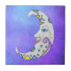 Este azulejo decorativo cerâmico tem uma lua crescente branca com uma face bonito que é decorada com abstrato em cores brilhantes de azul, amarelo e roxo com três estrelas sobre fundo do céu roxo.